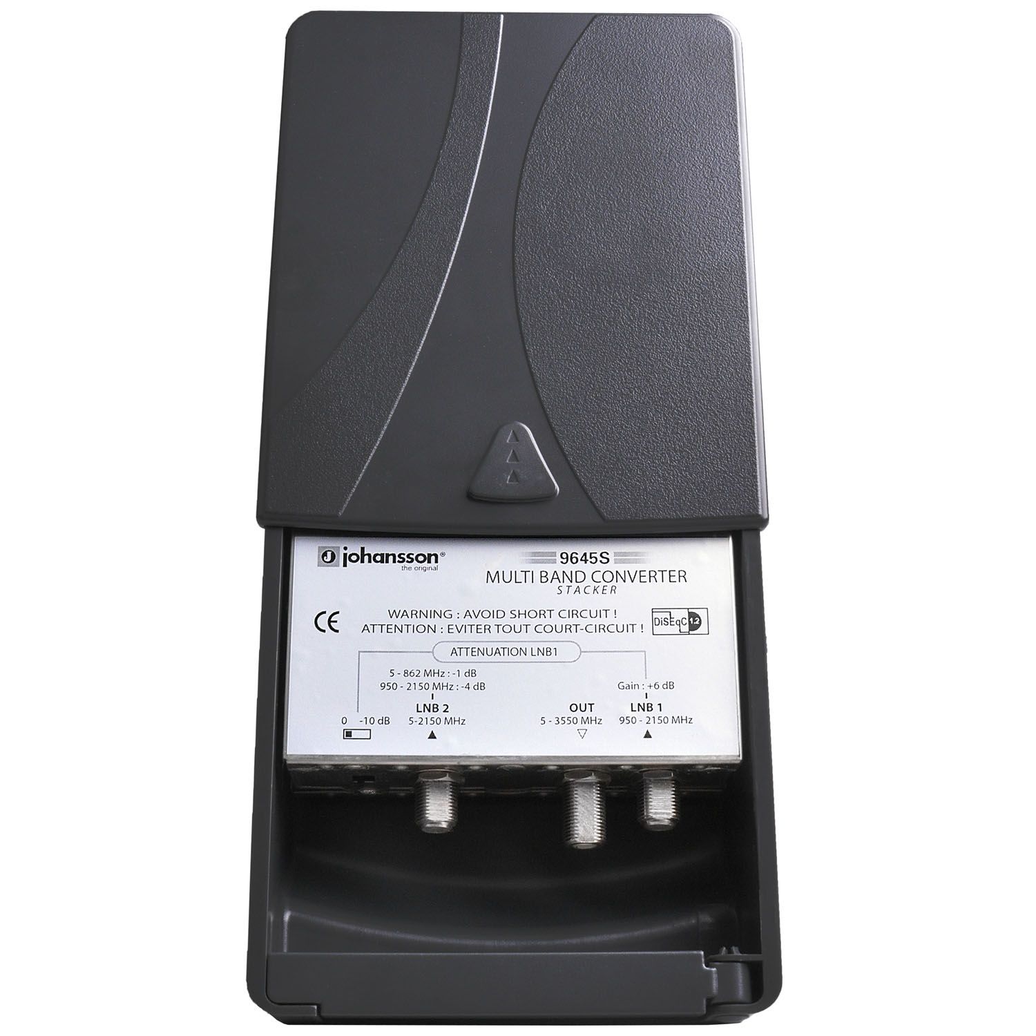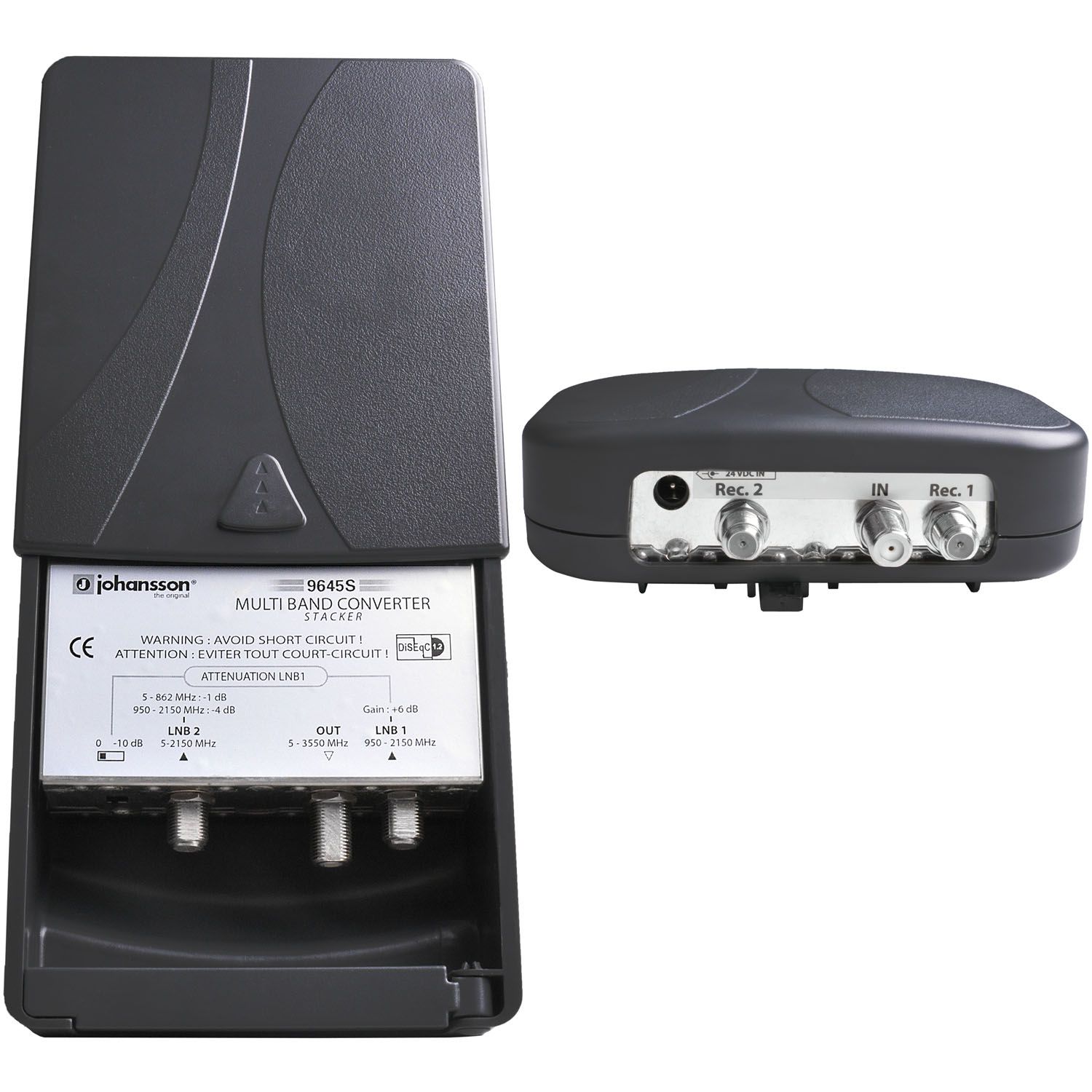 Der Johannson 9645 Stacker / deStacker kann bei Kabellängen bis zu 50 Meter eingesetzt werden. Die Eingangsfrequenzen 1 x (5-2150 Mhz) und 1 x (950-2150 Mhz) werden dabei gestapelt (to stack) und im Bereich 5-3550 Mhz über nur eine Koax-Leitung transportiert. Am Ende der Leitung wird der "deStacker" eingesetzt und entstapelt dann wieder in zwei Koax-Leitungen.
