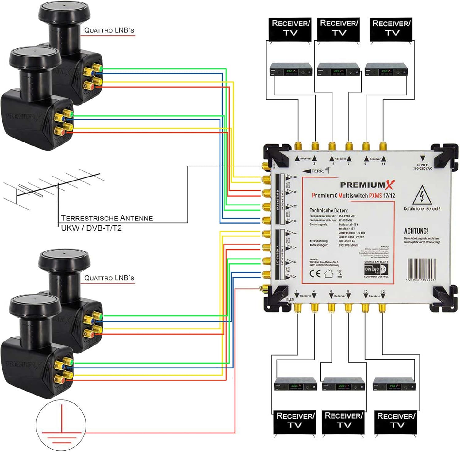 PremiumX PXMS 17/12 Multischalter mit Netzteil Multiswitch 4 SAT für 12 Teilnehmer