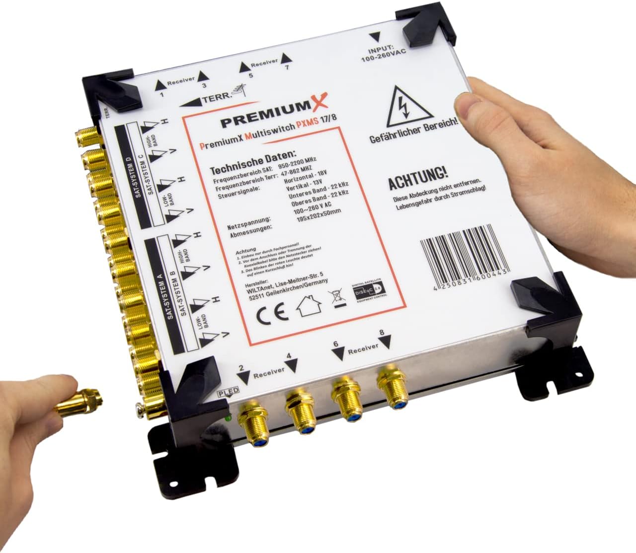 Der Satellitenmultischalter PremiumX PXMS-17/8 ist ein Bauteil einer Satelliten Empfangsanlage in Satblock-Verteiltechnik, der den Gemeinschaftsbetrieb von bis zu 8 Empfänger an einer Satellitenantenne mit vier Quattro LNB ermöglicht. Die Hauptaufgabe besteht in der Verteilung der vom LNB gelieferten Signale an die einzelnen Satellitenreceiver / Fernseher. Für den Empfang terrestrischer Antennensignale verfügt der Satellitenmultiswitch über einen Anschluss für eine terrestrische Antenne. Alle Teilnehmer können unabhängig voneinander die volle Programmvielfalt nutzen.